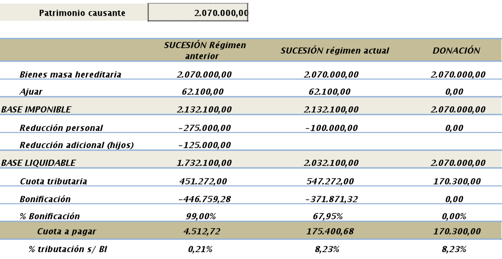 Como se observa, con un patrimonio del causante valorado en 2.070.000 Euros la tributación por sucesión se nivela con la resultante de la donación. Para patrimonios superiores, en cambio, la tributación por sucesiones será superior pues la bonificación de la cuota se irá reduciendo progresivamente.